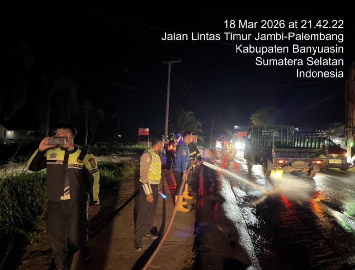 Oplus_131072 Humas Polres Banyuasin Polda Sumsel Banyuasin –Jajaran Kepolisian Resor (Polres) Banyuasin bergerak cepat merespons potensi bahaya di ruas jalan yang dapat mengganggu kelancaran arus mudik. Pada Rabu malam, 18 Maret 2026, pukul 21.45 WIB, personel gabungan dikerahkan untuk melakukan pembersihan jalan di area SPBU Sedompo, Kecamatan Betung, Kabupaten Banyuasin, akibat adanya tumpahan minyak solar yang membahayakan pengendara. Kegiatan ini dipimpin langsung oleh Kabag Ops Polres Banyuasin, Kompol Azmi Halim Permana, SIK, MAP. Beliau turun ke lokasi bersama Tim Patroli Perintis Presisi (Beat) Polres Banyuasin serta Kapolsek Betung. Langkah cepat ini diambil setelah menerima laporan bahwa tumpahan solar membuat badan jalan menjadi licin dan berpotensi tinggi menyebabkan kecelakaan lalu lintas, khususnya bagi kendaraan roda dua yang melintas di malam hari. “Kami dari Polres Banyuasin tidak ingin mengambil risiko. Begitu ada informasi tentang tumpahan solar di jalan, kami langsung bergerak. Ini adalah bentuk pelayanan nyata kami kepada masyarakat, khususnya warga Banyuasin dan para pemudik yang sedang dalam perjalanan. Keselamatan di jalan adalah prioritas utama kami,” tegas Kompol Azmi Halim Permana di lokasi kejadian. Dengan sigap, para petugas yang didominasi oleh personel Satuan Lalu Lintas dan Samapta Polres Banyuasin ini melakukan pembersihan secara manual. Menggunakan pasir dan peralatan seadanya, mereka bahu-membahu menyerap tumpahan solar hingga kondisi jalan kembali normal dan aman untuk dilintasi. Proses evakuasi dan pembersihan berlangsung hingga pukul 22.30 WIB dan situasi selama kegiatan berlangsung dalam keadaan aman serta kondusif. kegiatan ini merupakan bagian dari kesiapsiagaan pihaknya dalam mengamankan arus mudik. Pembersihan jalan dari tumpahan minyak di SPBU Sedompo Betung menjadi salah satu upaya preventif untuk memastikan setiap ruas jalan di wilayah hukum Polres Banyuasin dalam kondisi layak dan aman. “Dengan respons cepat seperti ini, kami berharap masyarakat dapat merasa aman dan nyaman. Kami ingin perjalanan mudik di Banyuasin ini berjalan lancar, aman, dan selamat sampai tujuan,” ucapnya Navigasi pos Lakukan Anev Konsolidasi Ops Ketupat Hari Ke-5, Kapolda Sumsel Pastikan Pos Pam Jadi Pusat Solusi Masyarakat Kapolda Sumsel Pastikan Malam Takbiran Aman, 4.303 Personel Disiagakan Penuh
