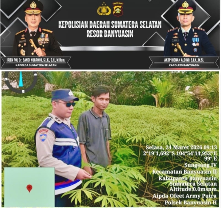 Humas Polres Banyuasin Polda Sumsel Banyuasin – Dalam upaya mendukung program strategis nasional, Aipda Ofeet Army Putra, Bhabinkamtibmas Polsek Banyuasin II, melaksanakan kegiatan himbauan dan penggerakan masyarakat di Desa Sungsang IV, Kecamatan Banyuasin II, Kabupaten Banyuasin, pada Selasa (24/3/2026). Kegiatan yang berlangsung mulai pukul 13.00 WIB hingga selesai ini difokuskan pada program P2B (Pangan, Papan, dan Bersih) sebagai bentuk dukungan nyata terhadap program Presiden RI dalam mewujudkan Swasembada Pangan Nasional. Dalam giatnya, Aipda Ofeet Army Putra mengajak warga setempat untuk berperan aktif dalam memperkuat ketahanan pangan dari tingkat desa. Himbauan tersebut disambut positif oleh masyarakat yang antusias mendukung langkah pemerintah dalam mencapai kemandirian pangan. Sepanjang pelaksanaan kegiatan, situasi di Desa Sungsang IV terpantau aman dan kondusif. Kegiatan ini juga didokumentasikan sebagai bentuk pertanggungjawaban pelaksanaan tugas. Oplus_131072 Navigasi pos Bhabinkamtibmas Polsek Air Kumbang Bergerak, Ajak Warga Dukung Program Swasembada Pangan Nasional Antisipasi Kepadatan Arus Balik H+4, Sat Lantas Polres Banyuasin Gelar Live Report dan Patroli Hunting di Jalintim